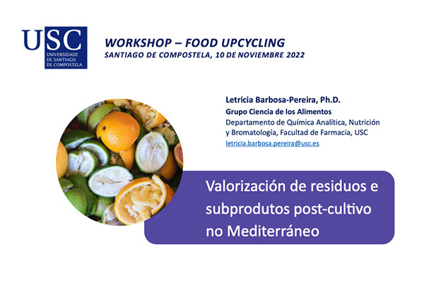 On November 10, 2022, at the School of Engineering (Escola Técnica Superior de Enxeñaría), the Galician Food Cluster organized the workshop “FOOD UPCYCLING: Innovating from By-products and Food Waste.” The FoodChemPack group at the University of Santiago de Compostela (USC), coordinators of the VALICET project, participated in Session II – Advances in R&D towards Food Upcycling, with the presentation “Valorization of Post-harvest Residues and By-products in the Mediterranean.” This contribution highlighted the project’s commitment to sustainable innovation through the upcycling of agro-industrial waste.